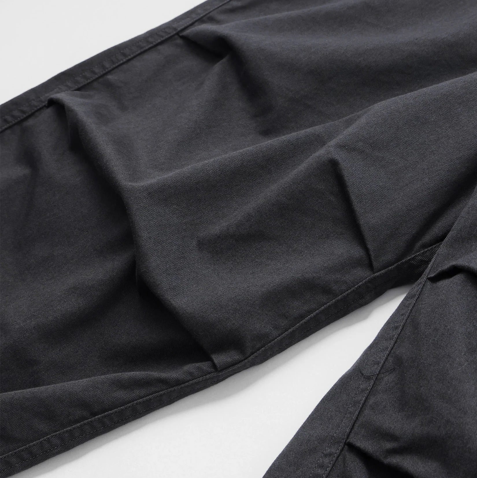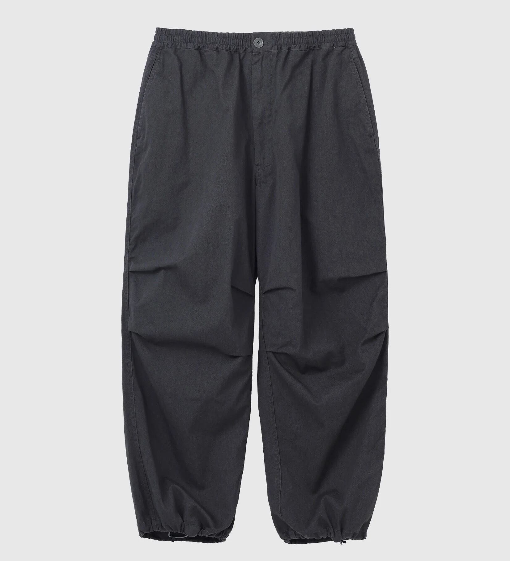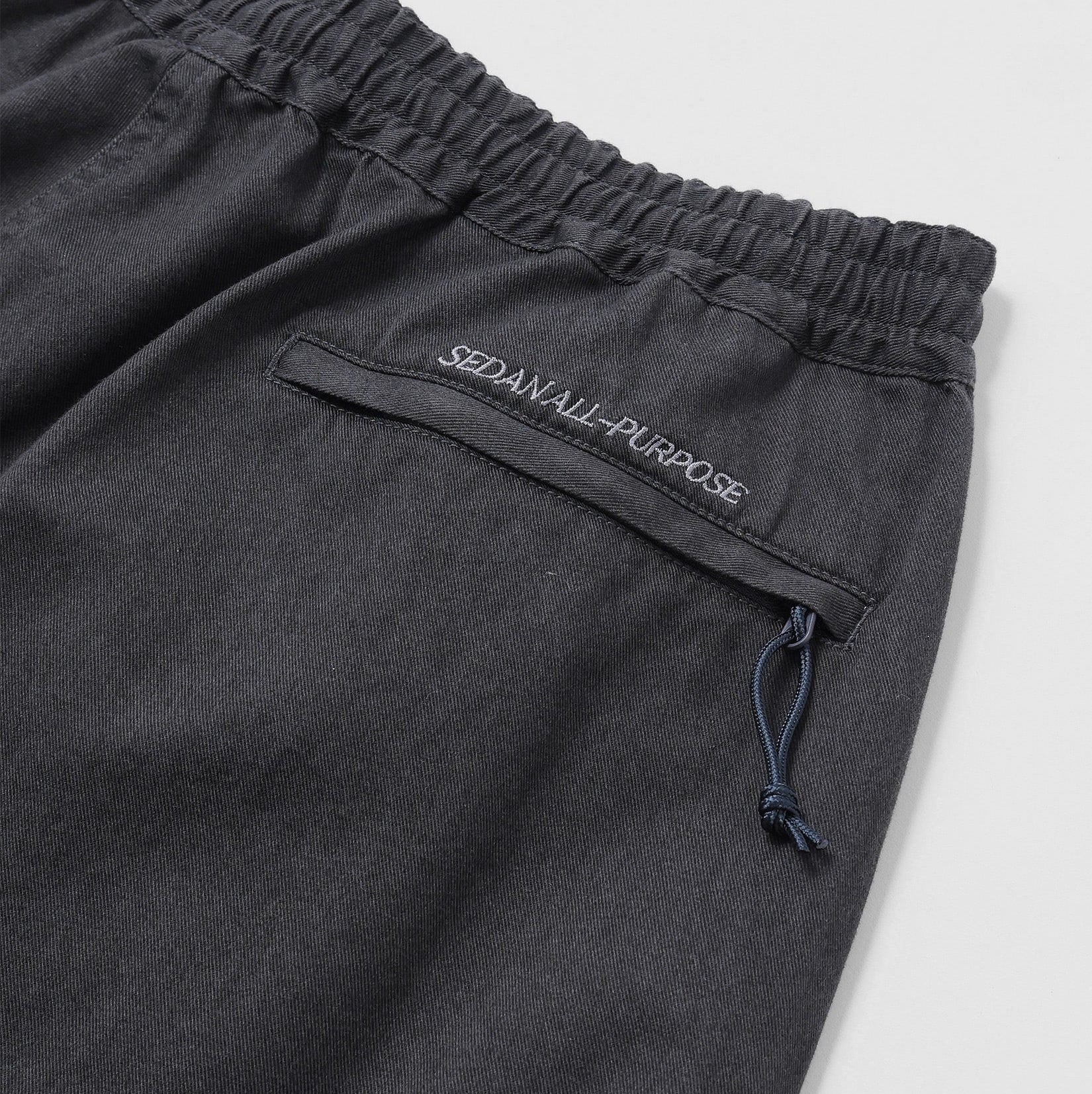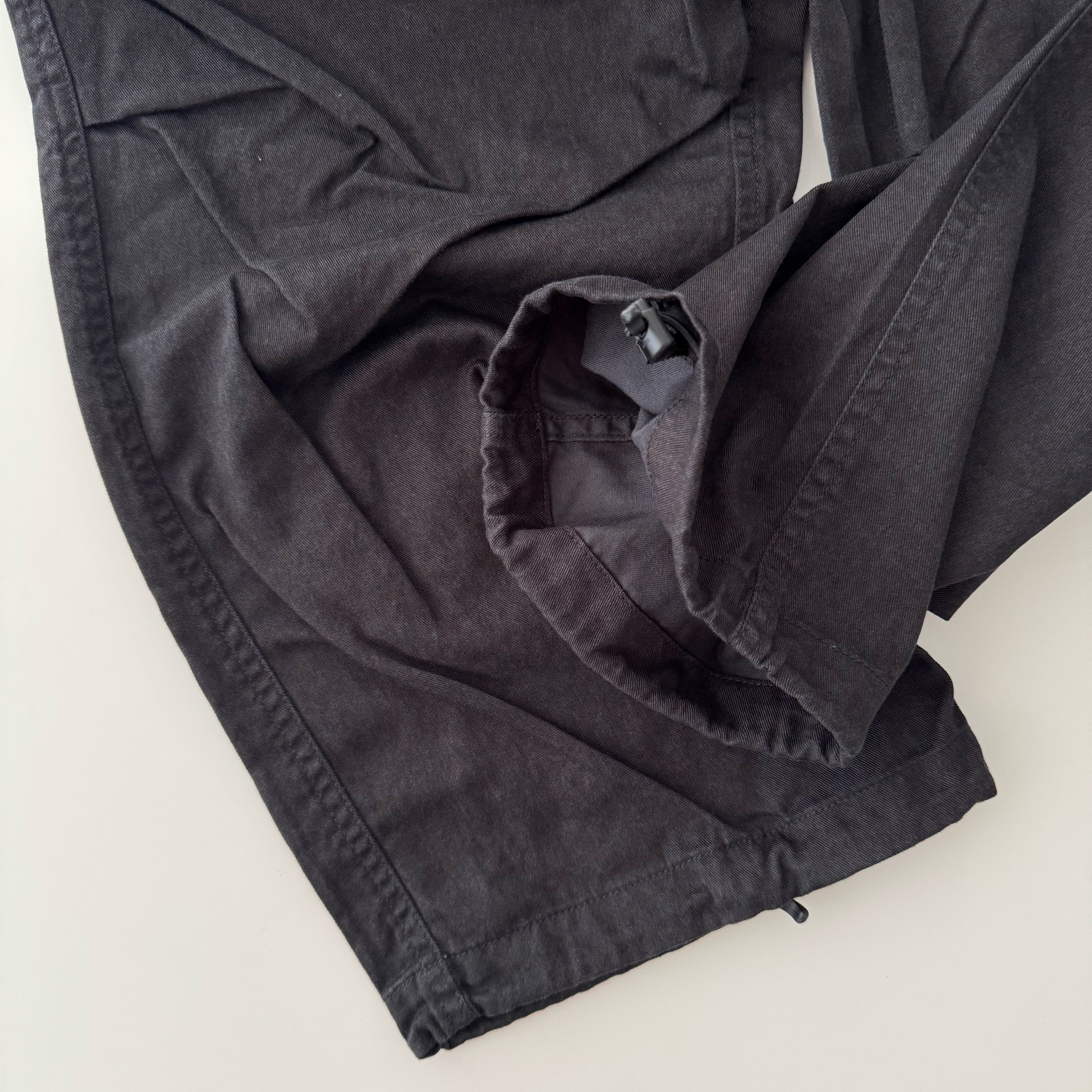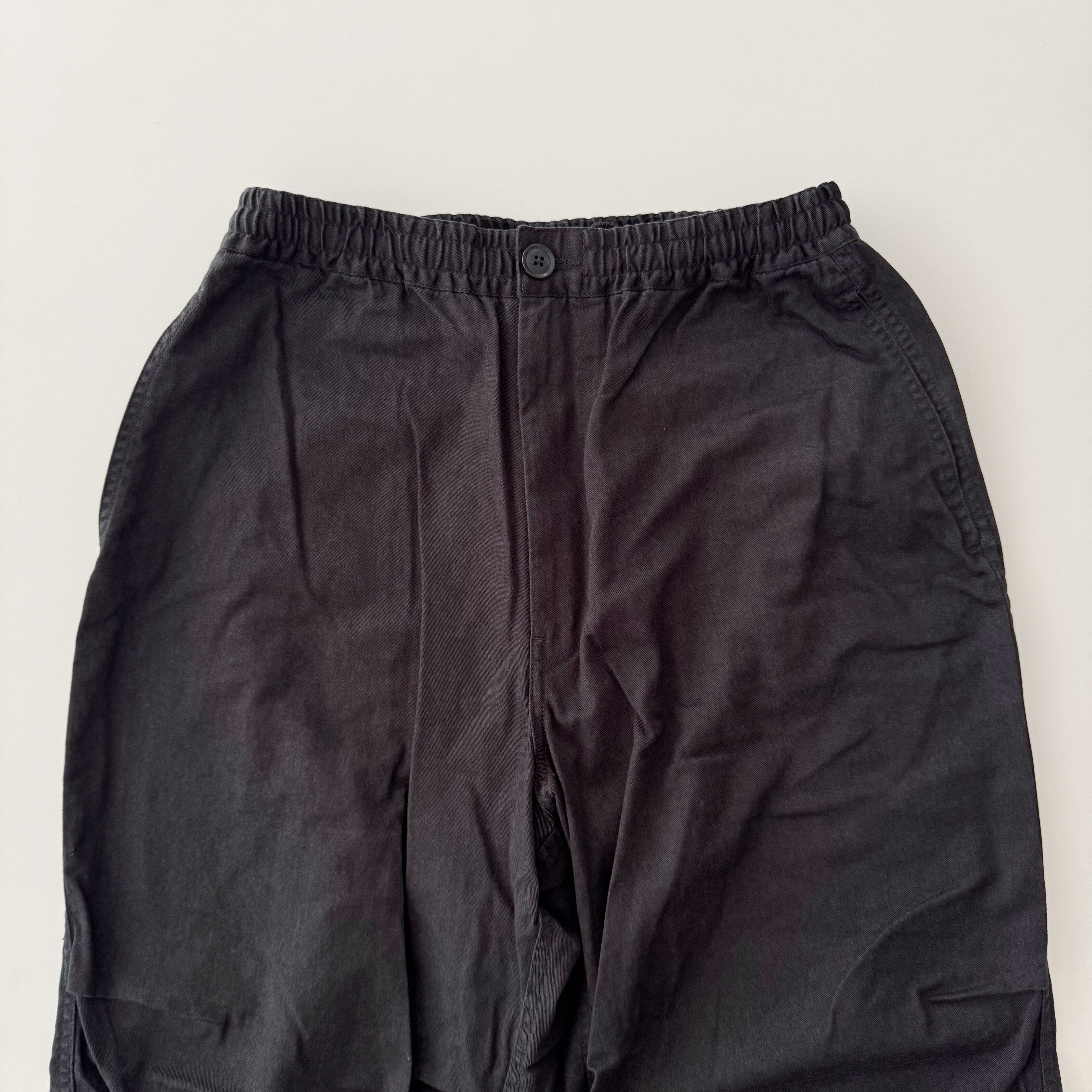 「最近は定番で作っているオーバーパンツ。通年履けるコットンツイルに洗い加工を施してビンテージっぽい雰囲気に仕上げました。定番とはいいつつもシルエットも定期的にアップデートしているので大変履きやすく、良いシルエットが出ていると自賛しております。ウエストはゴムと紐で調節可能。裾もドローコードで絞れます。ヒップポケットはファスナーポケット。ヒップポケット口にロゴ刺繍入り。左太腿部分にちょっと変わった形のスマホポケット付き。」