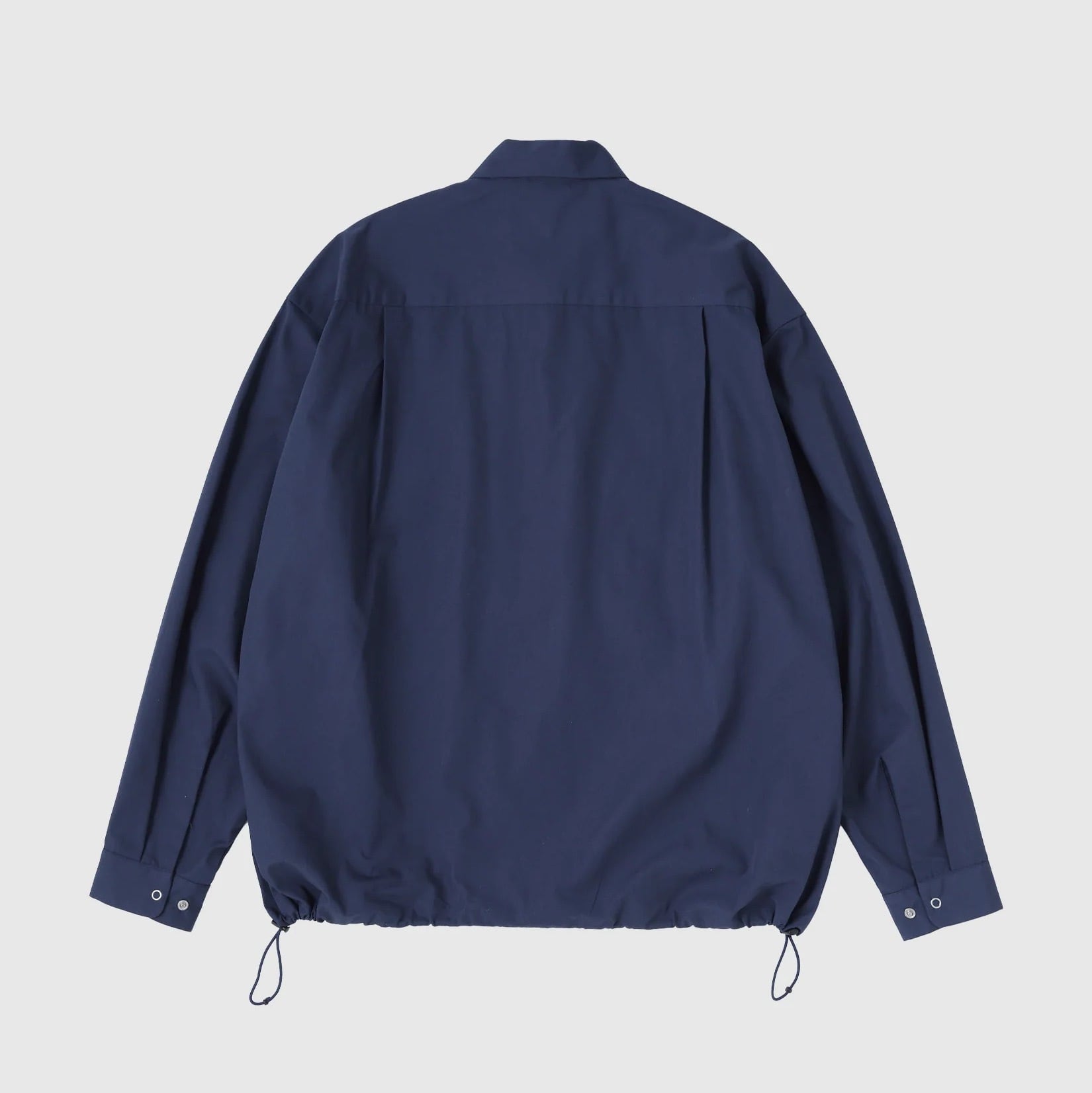 「毎年リリースしているワークシャツ。今シーズンは新型でお届けします。生地は昔ながらの硬めのTCポプリン。昔はコスト削減の為であろうステッチがほどんど入らない仕様。リングスナップボタンも懐かしくていい感じです。シャツなのに腰ポケットを付けたり、裾を絞れたりするので、ブルゾン感覚でも羽織っていただけます。左胸にはオーバルロゴ入り。右胸のポケットにはペンホルダーポケット付き。」
