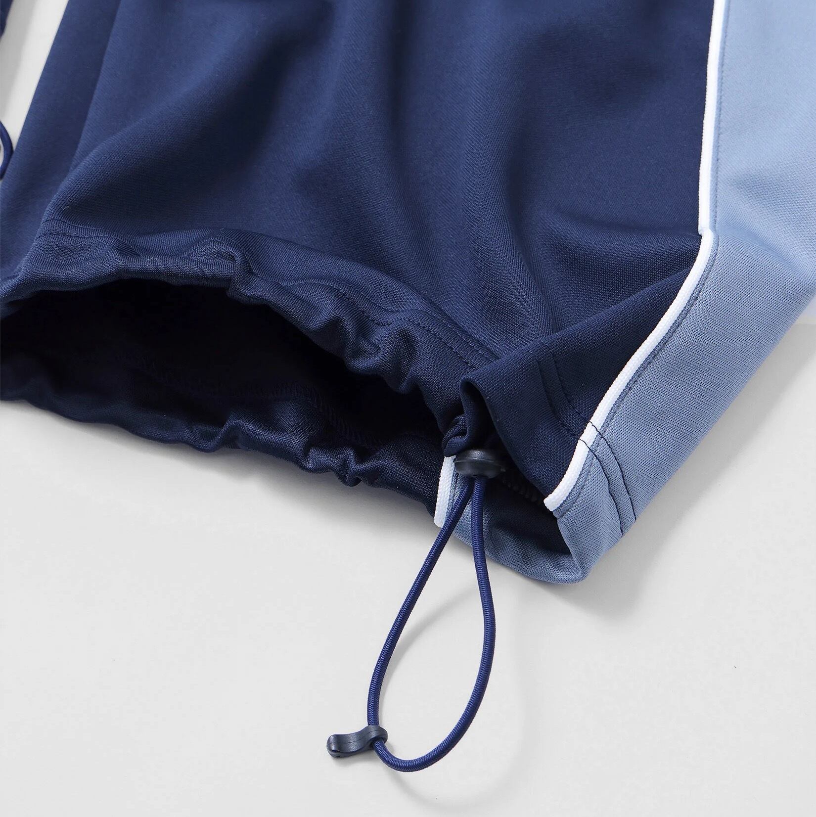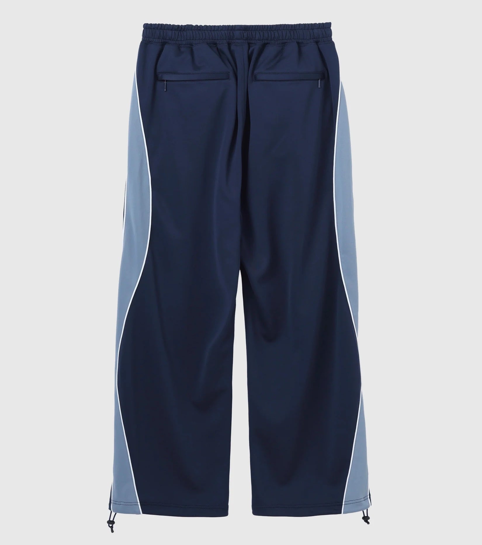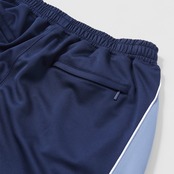 「2000年代初頭の無駄に流線型を多用した服が作られた時代がある。スポーツからアウトドア、デニムに至るまでありとあらゆるジャンルで作っていたのが古着屋さんを周っているとわかる。そんな時代に影響を受けて、トラックパンツを作った。ポリウレタン無しでハイストレッチを実現した、AQUATWIST®の生地を使用。配色もレトロな物から今着たいカラーまで揃った3色展開。ウエストはゴムと紐で調節可能。左前太腿部にロゴ刺繍入り。裾のドローコードでシルエット調節可能。」