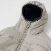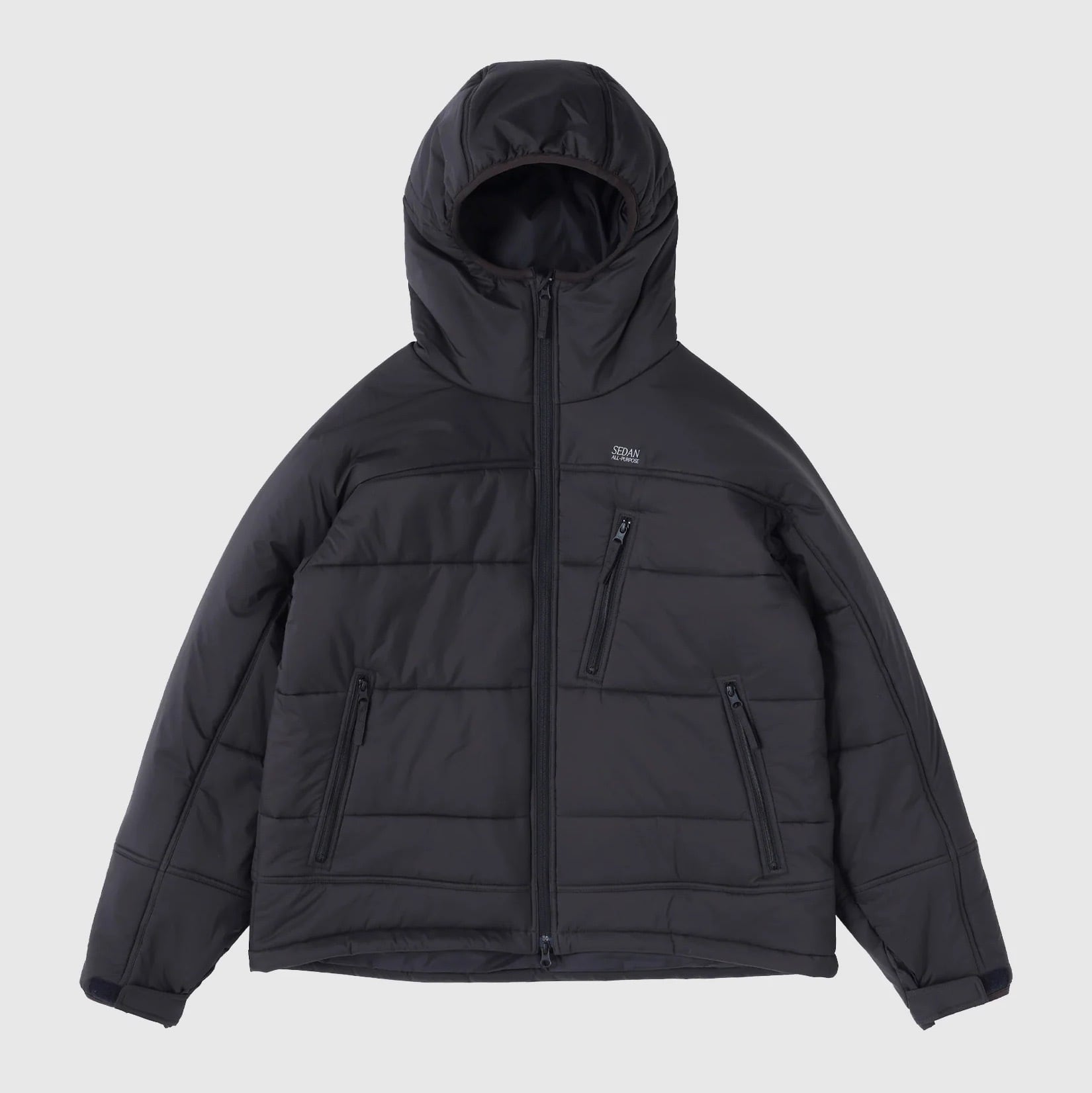 「ダウンも好きだがそれ以上によく着ているのが中綿入りのジャケット。軽い、洗える、あんまりスタイル選ばない(ような気がする)とサクッと着るのにちょうどいいのだ。さらにフードが付いていたら最高ということで、大好きなあのモデルをベースに一番欲しい中綿のアウターを作った。シェルには防風性の高いマイクロリップ生地を使用。リサイクルナイロン100%の生地はほどよくマットで裏地との配色も最高。アウトドアから街まで違和感なく着れる。フードもボリュームがあり、被ったスタイルもよい、セダン的推しの一着。胸にセダンのロゴ刺繍。フードの後ろ、身頃裾にアジャスター。ビッグサイズの内ポケット2つ。」