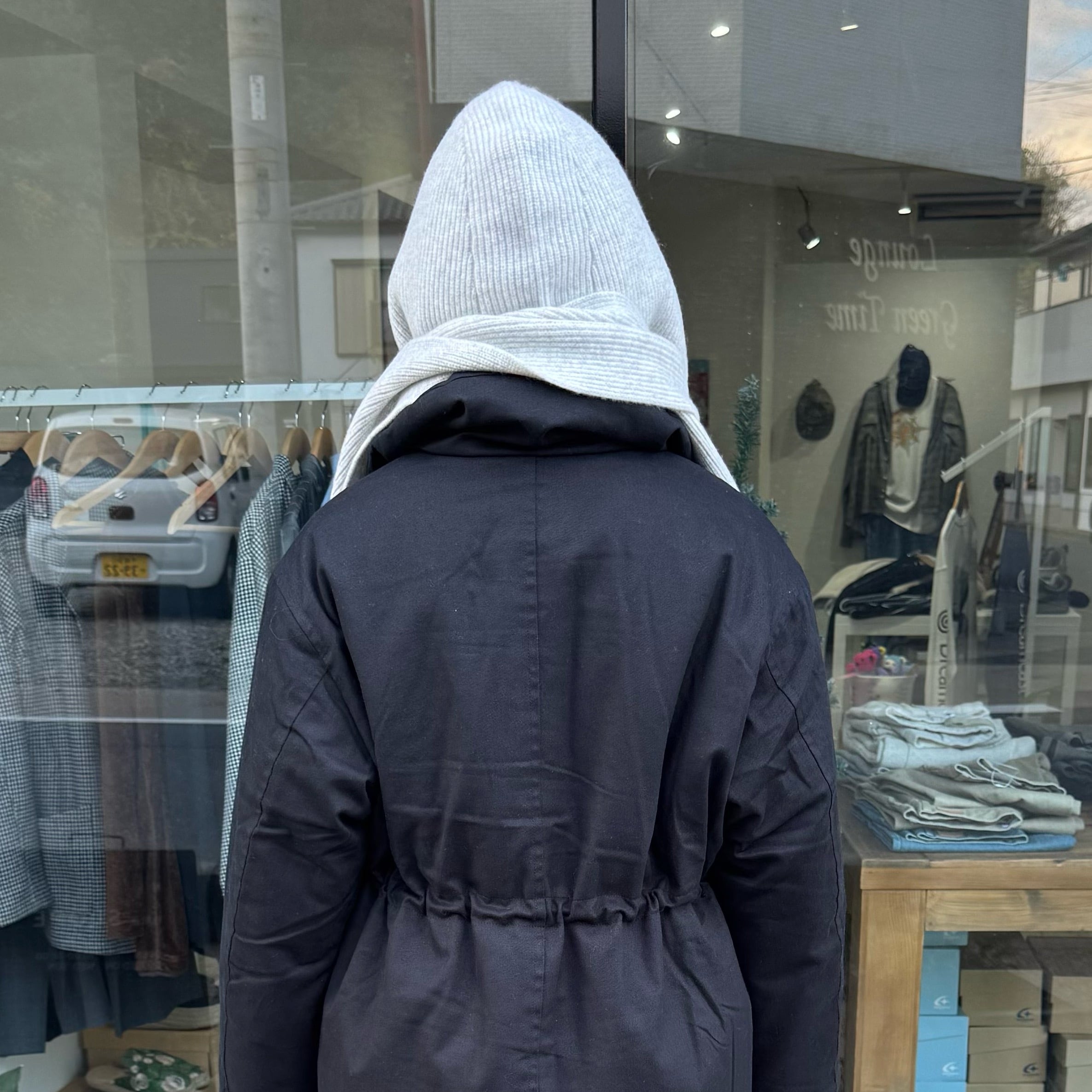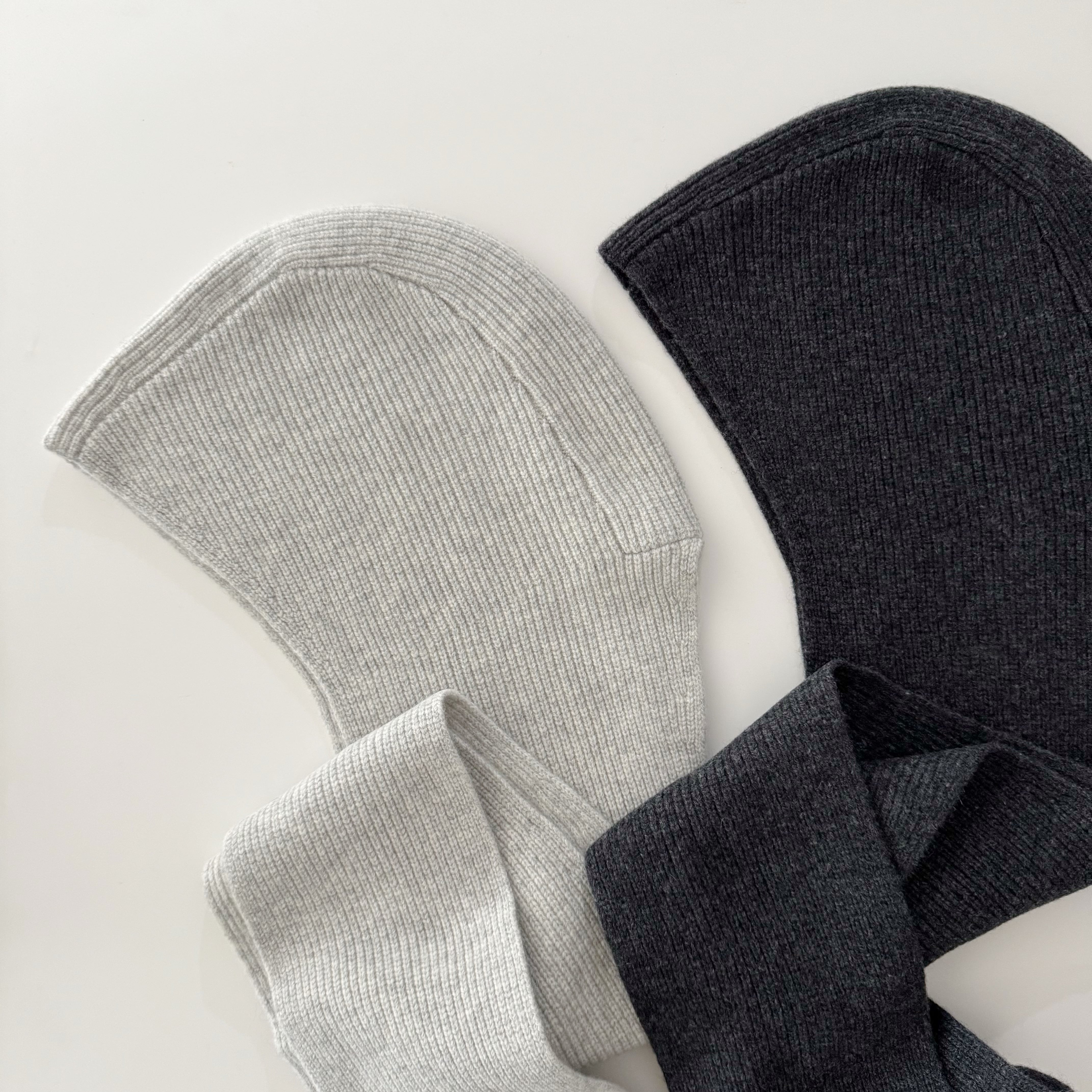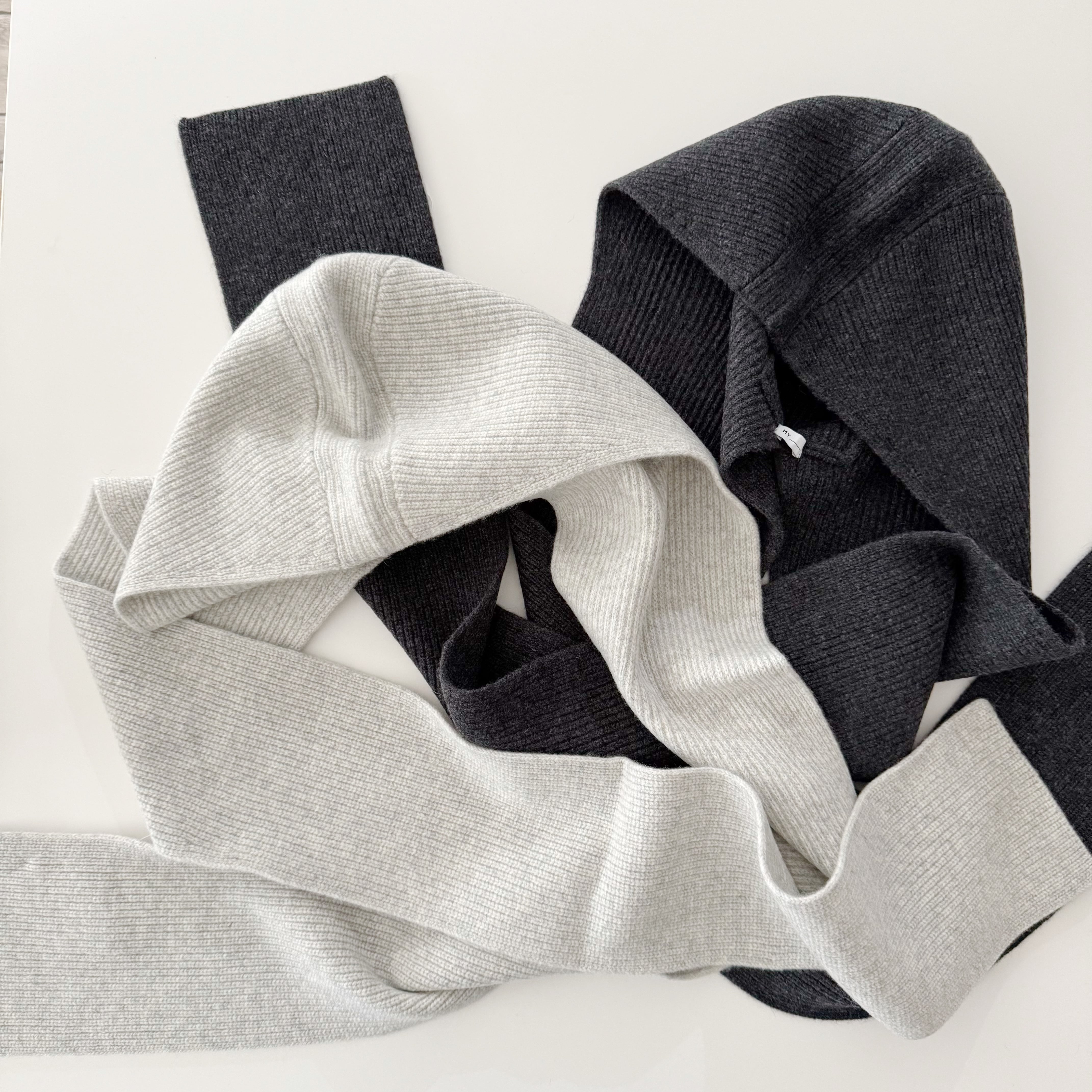 カシミアウールの糸で編んだ、マフラー付きバラクラバ。
