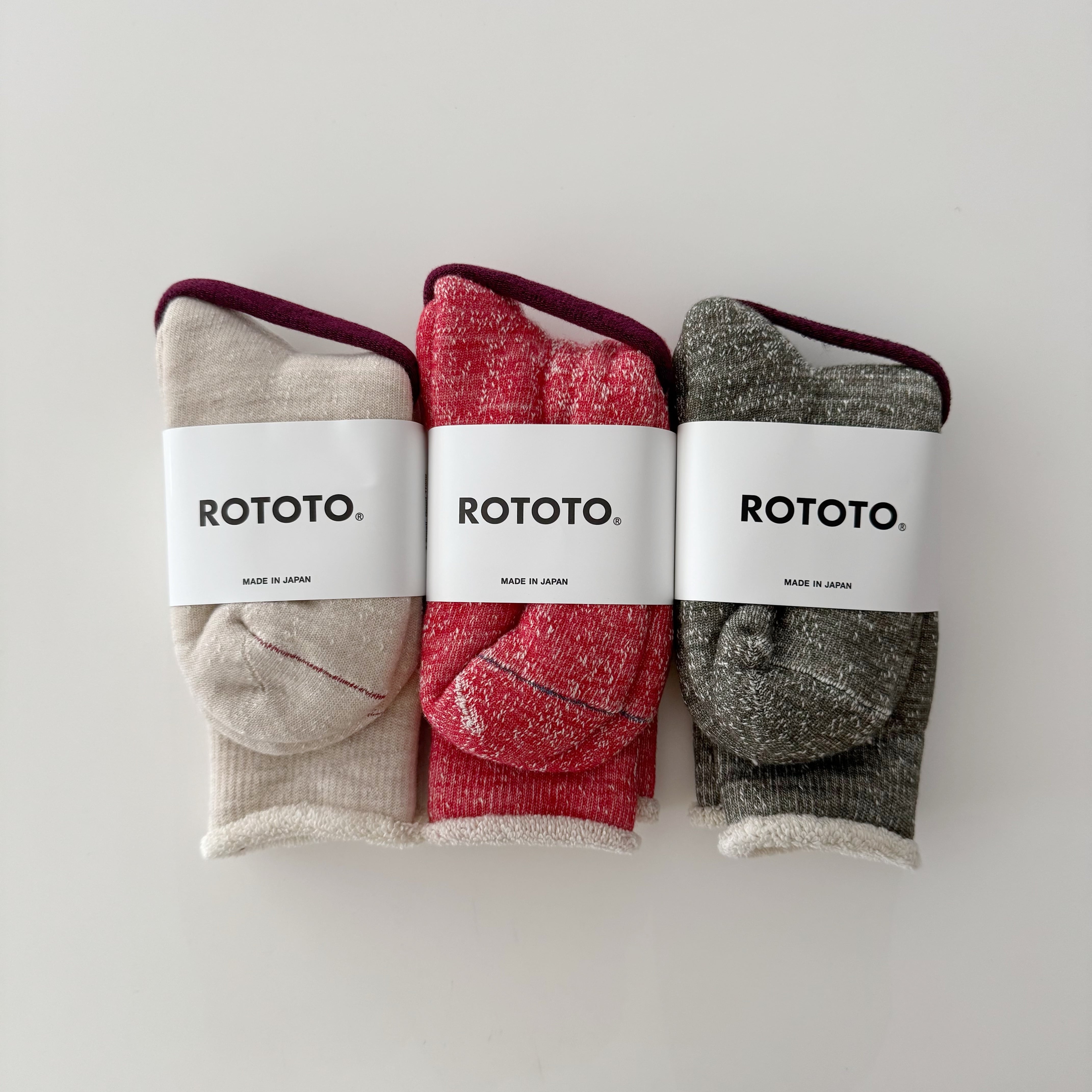 登山用ソックスから着想を得たダブルフェイス仕様のソックスは、ブランドスタート時より展開する〈ROTOTO〉のスタンダードアイテム。外側にはメリノウール、内側には未染色の太番手のオーガニックコットンを使用し、スウェットシャツのような肉感を表現。また、内側のオーガニックコットンをループ状に編み立てることで、肌あたりの優しいふっくらとした風合いに仕上げています。