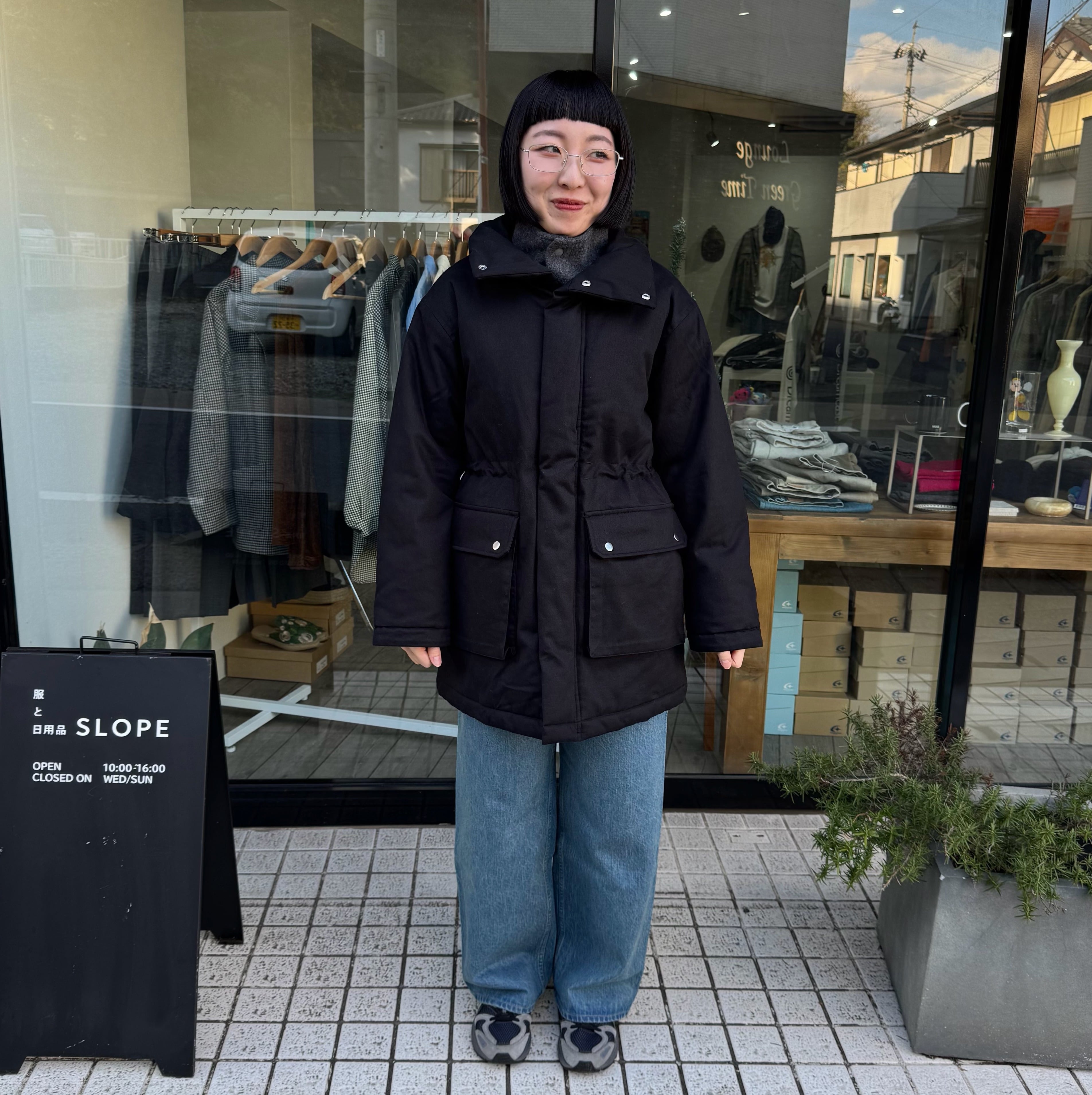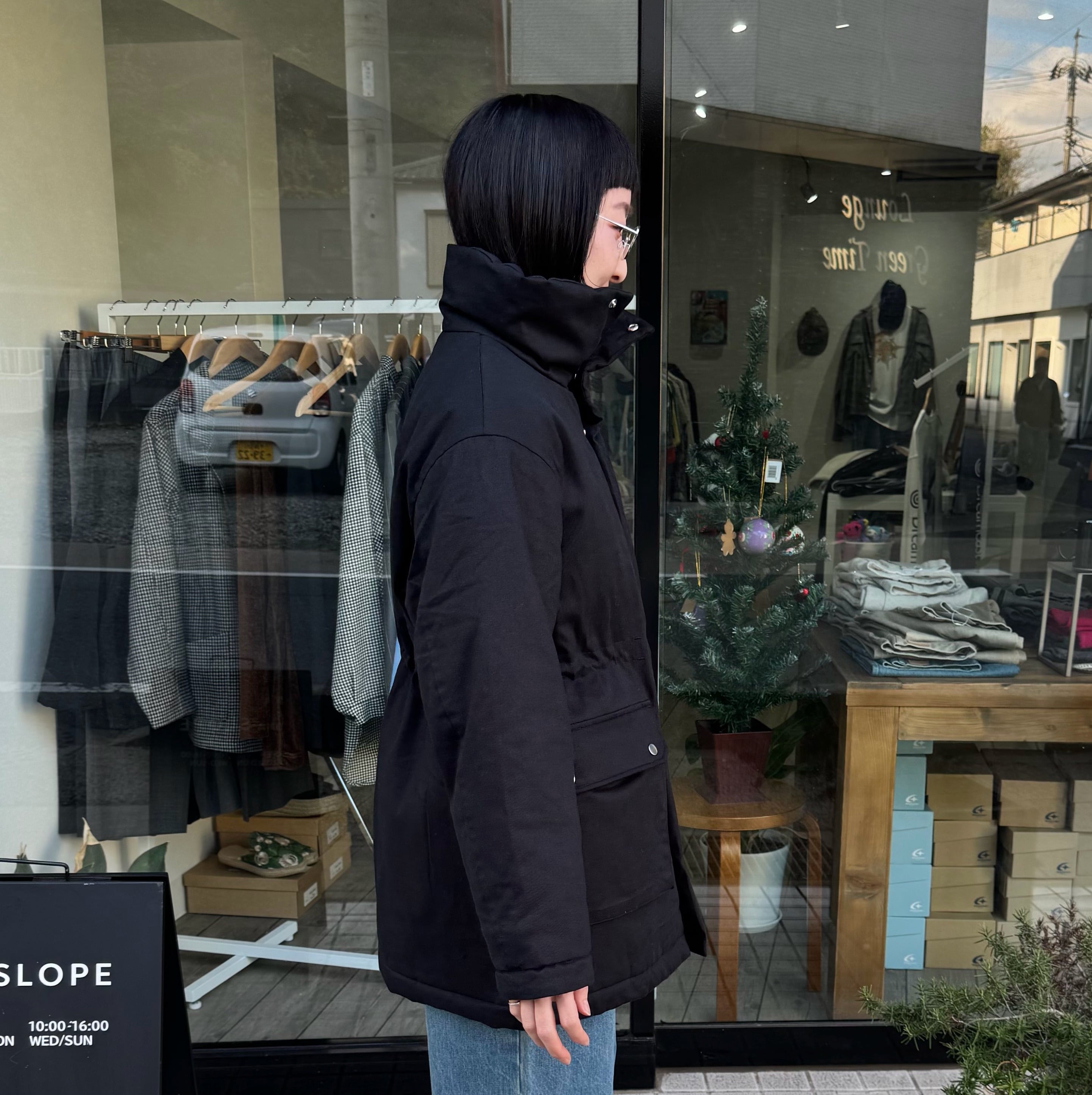 大きめなスタンドカラーが特徴で、ウエスト部分にはゴムが入っており絞れるようになっています。