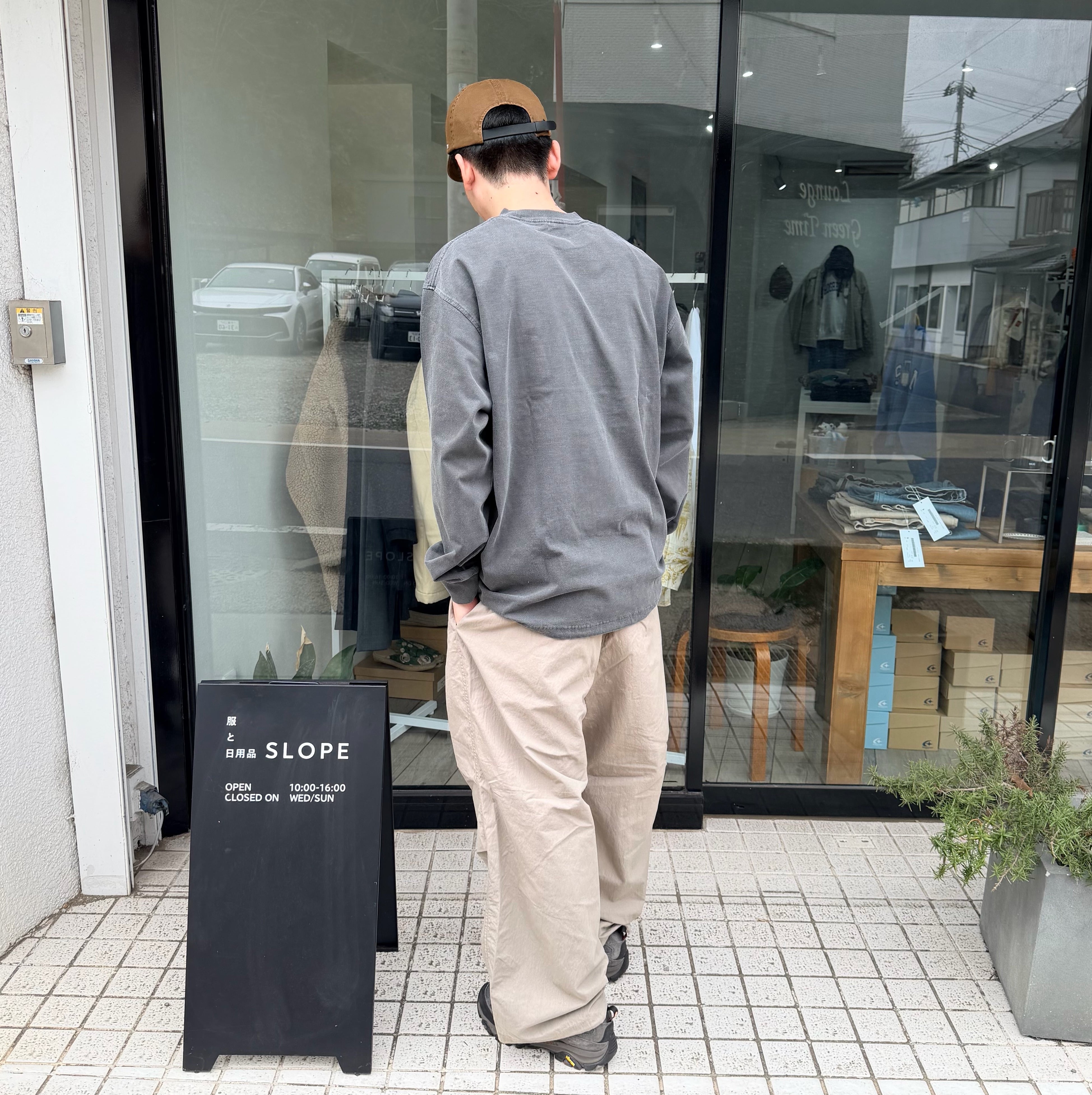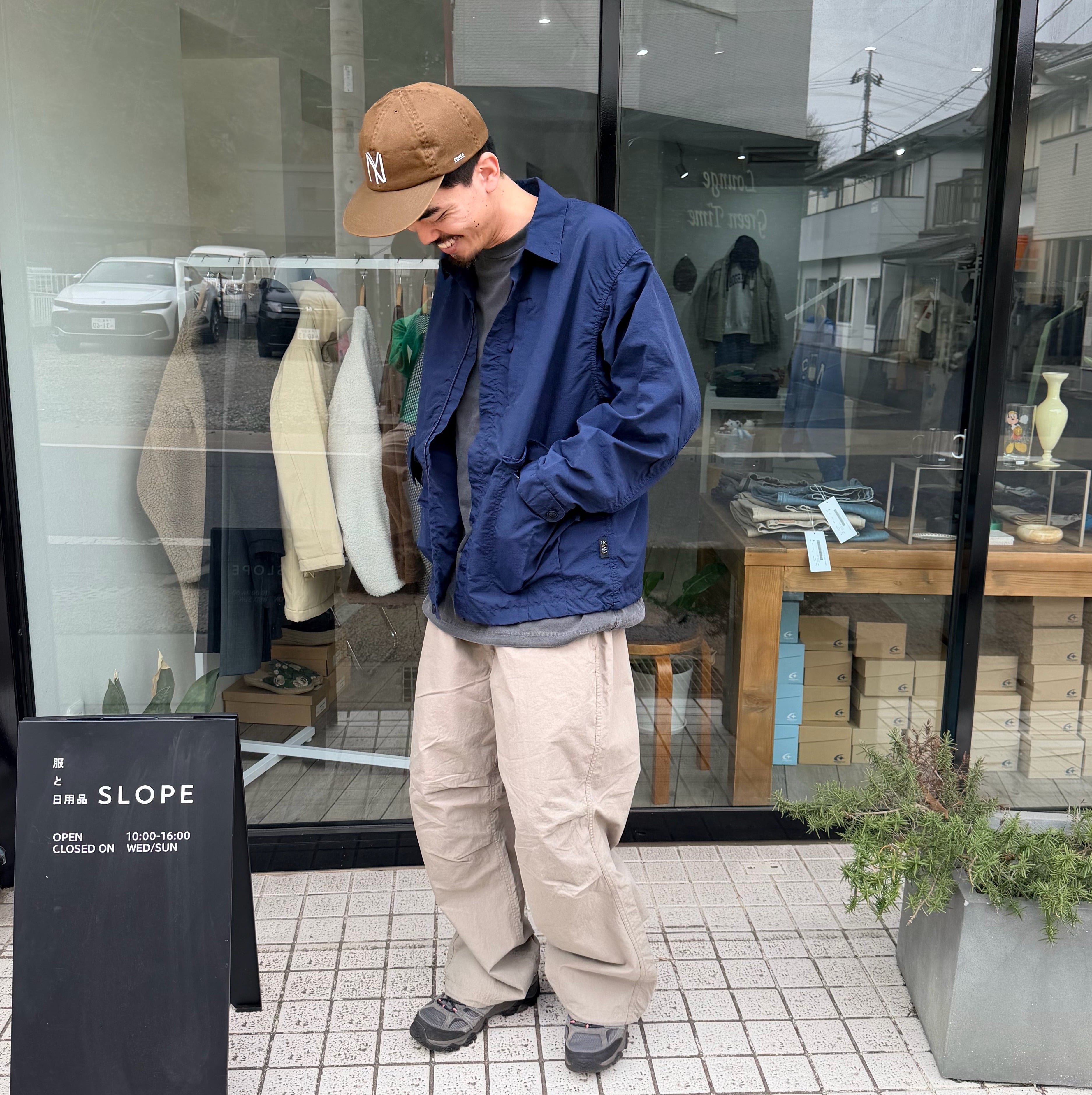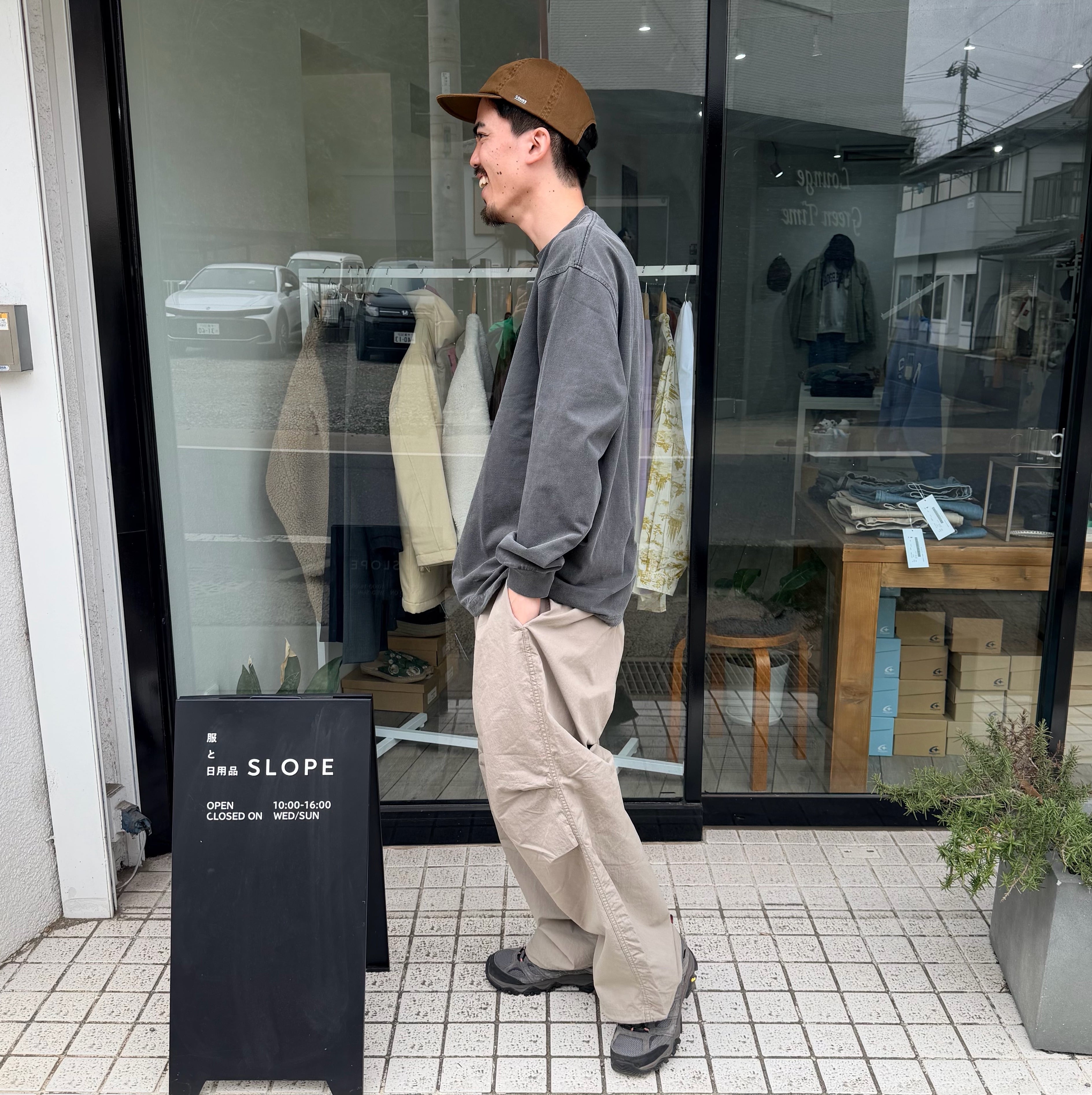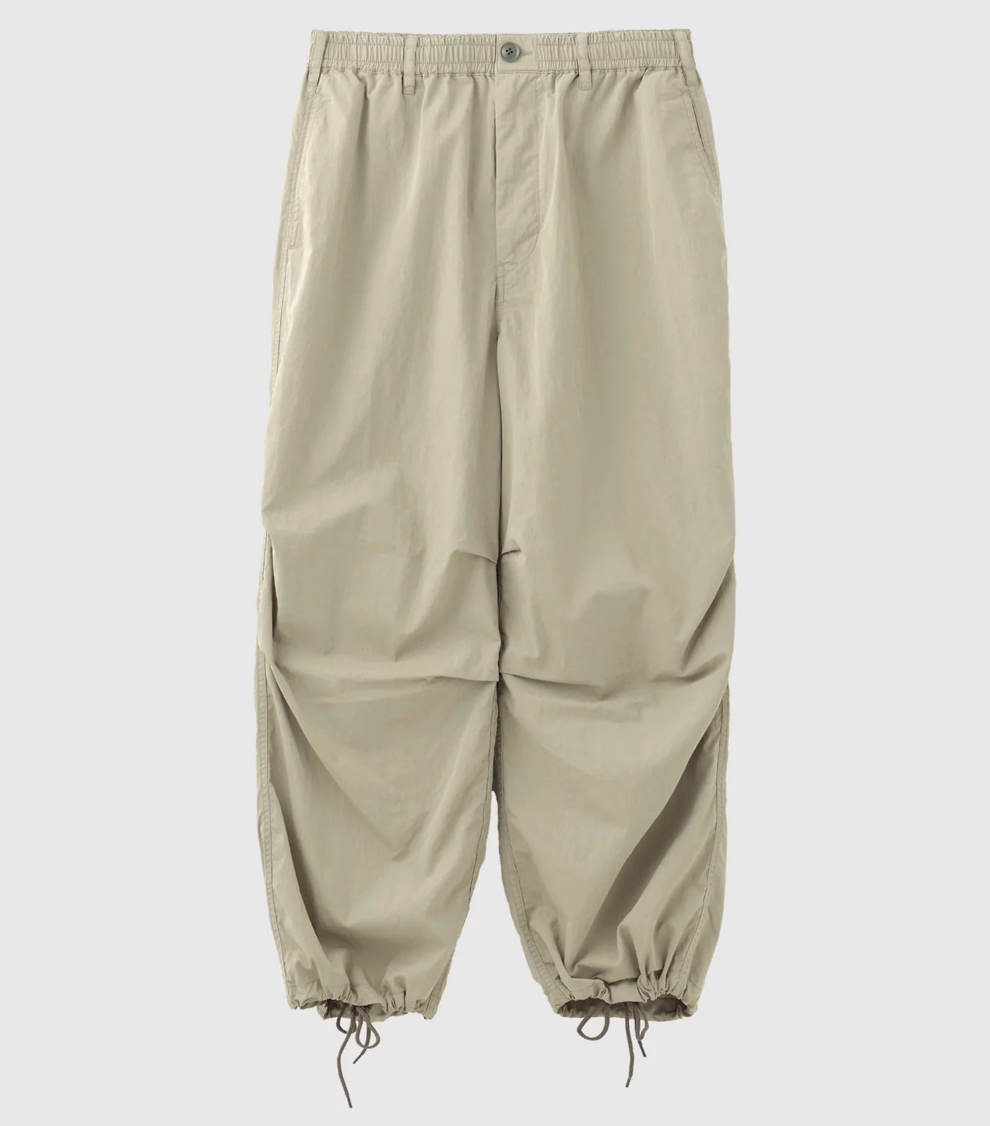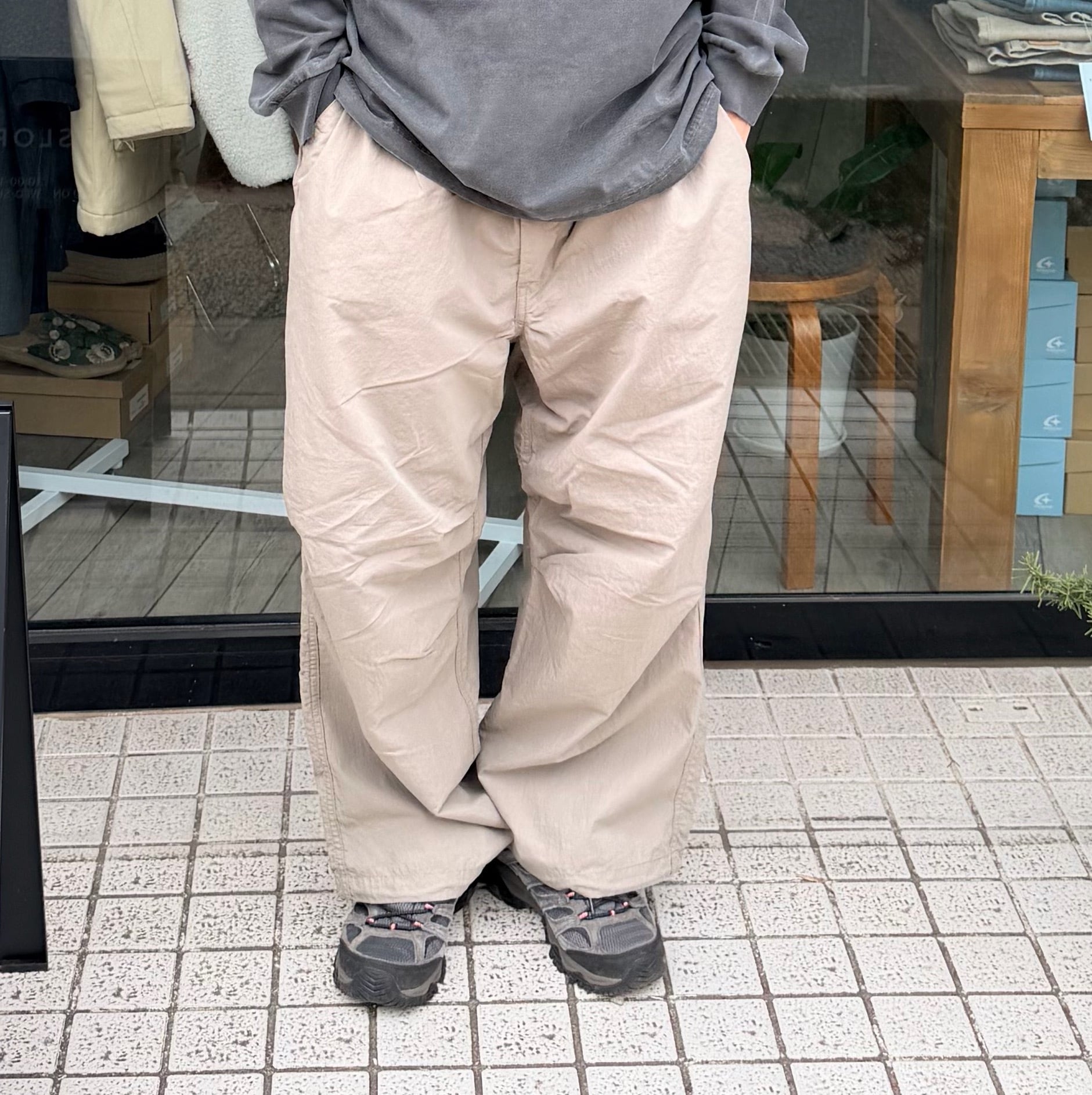 「定番で作っているオーバーパンツですが、今年は裾幅を広げてよりワイドフィットに。生地はコットンxナイロンで、製品洗いしているのでシャカシャカでもバリバリでもない雰囲気のある1本に仕上がりました。ウエストはゴム+紐、裾にも紐、バックポケットはファスナー開き。」