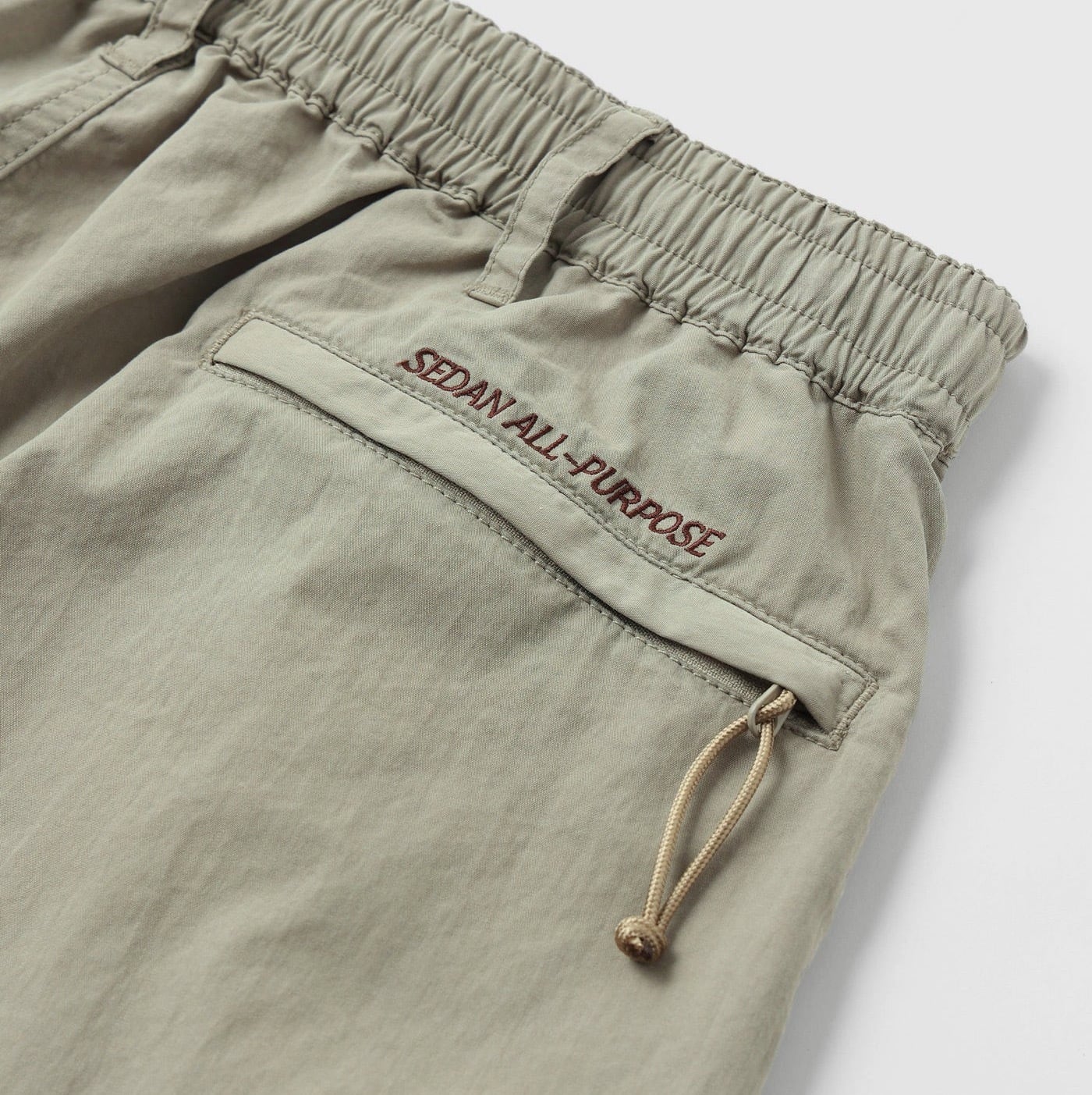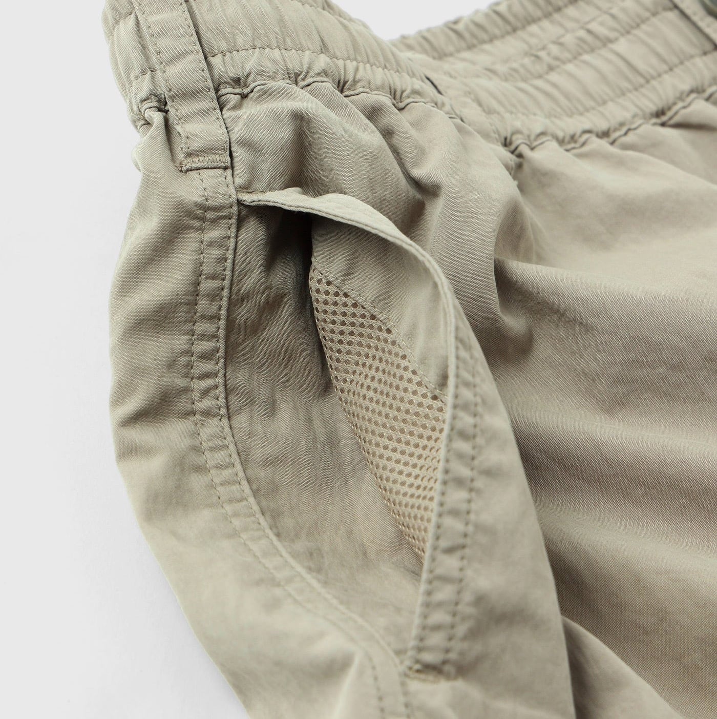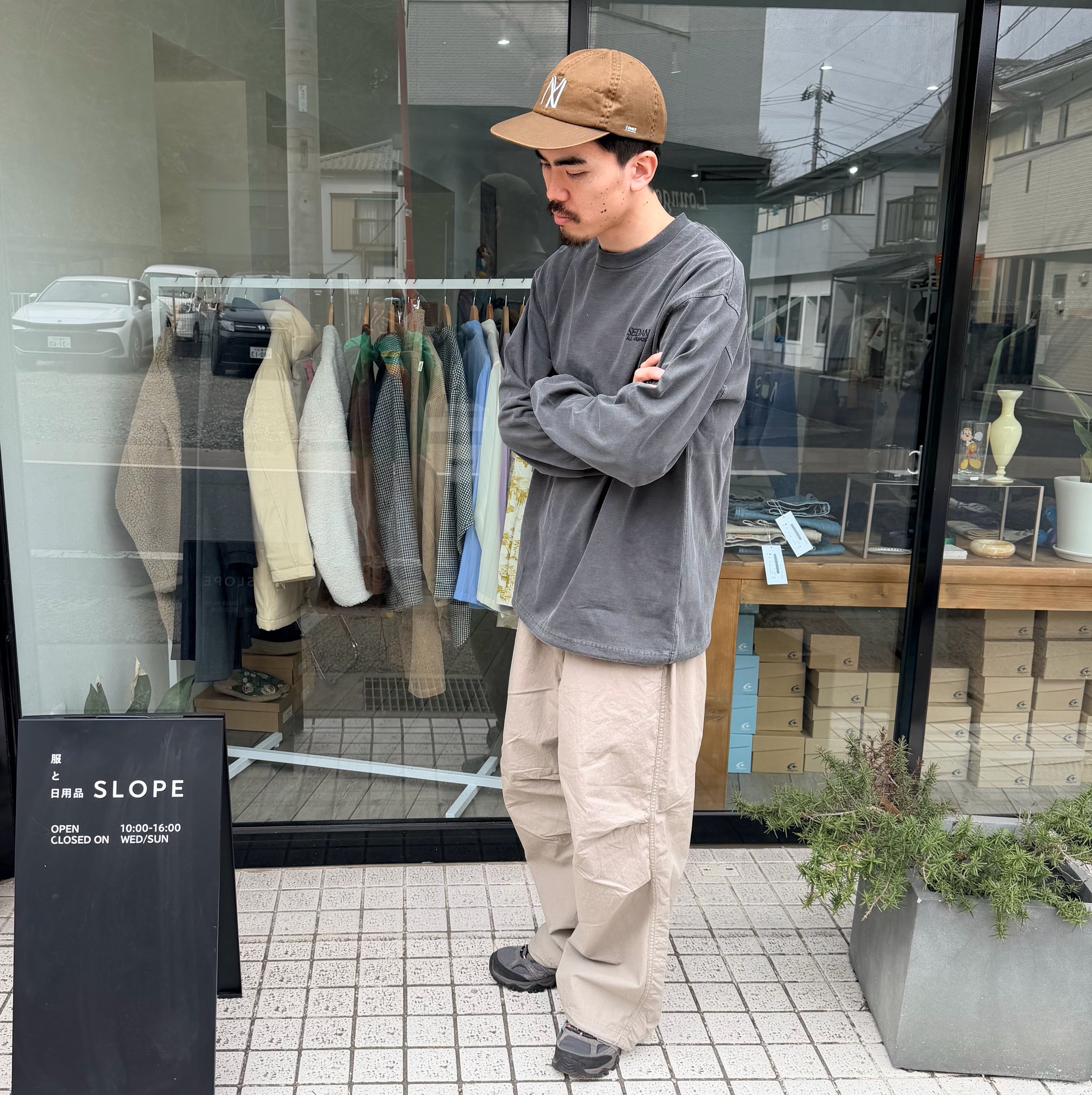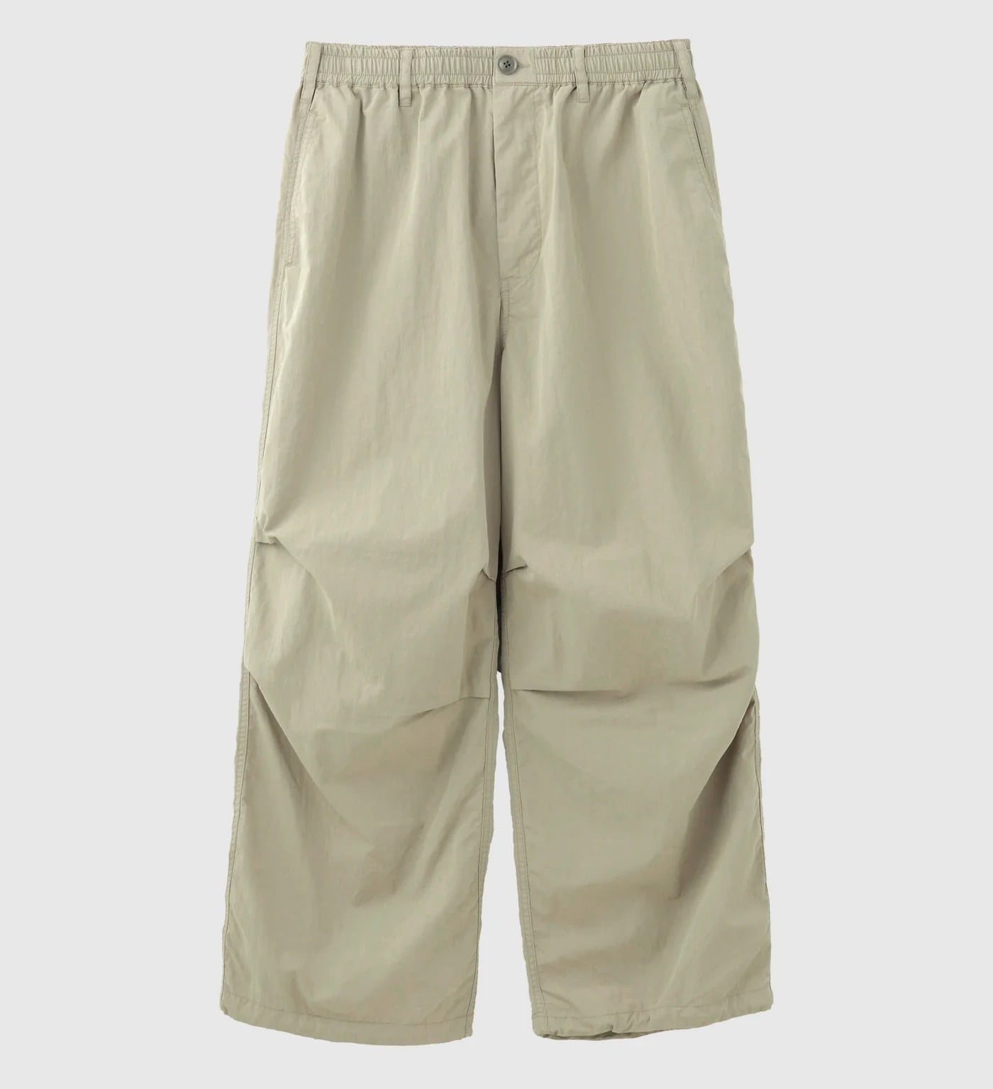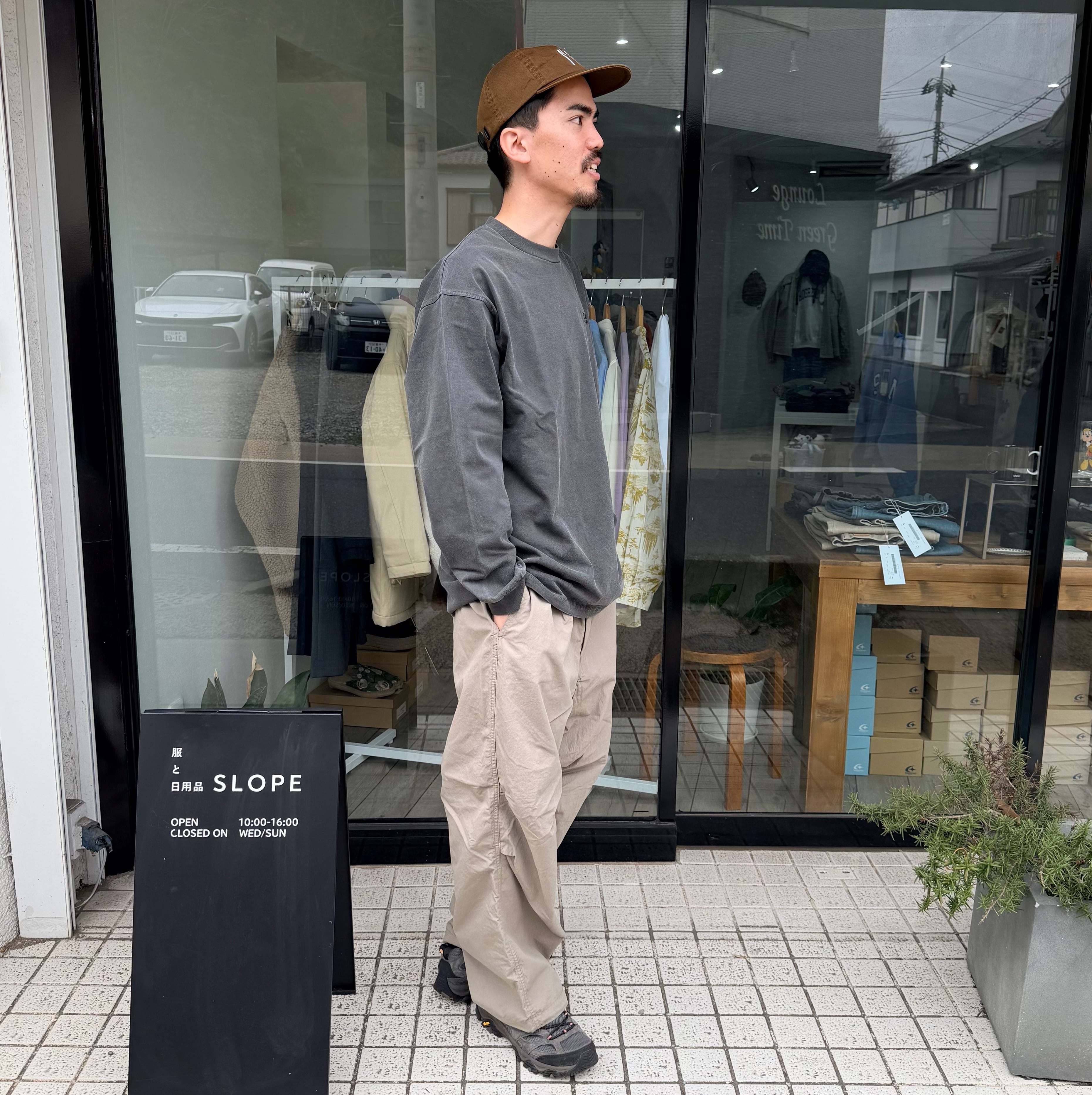 「定番で作っているオーバーパンツですが、今年は裾幅を広げてよりワイドフィットに。生地はコットンxナイロンで、製品洗いしているのでシャカシャカでもバリバリでもない雰囲気のある1本に仕上がりました。ウエストはゴム+紐、裾にも紐、バックポケットはファスナー開き。」