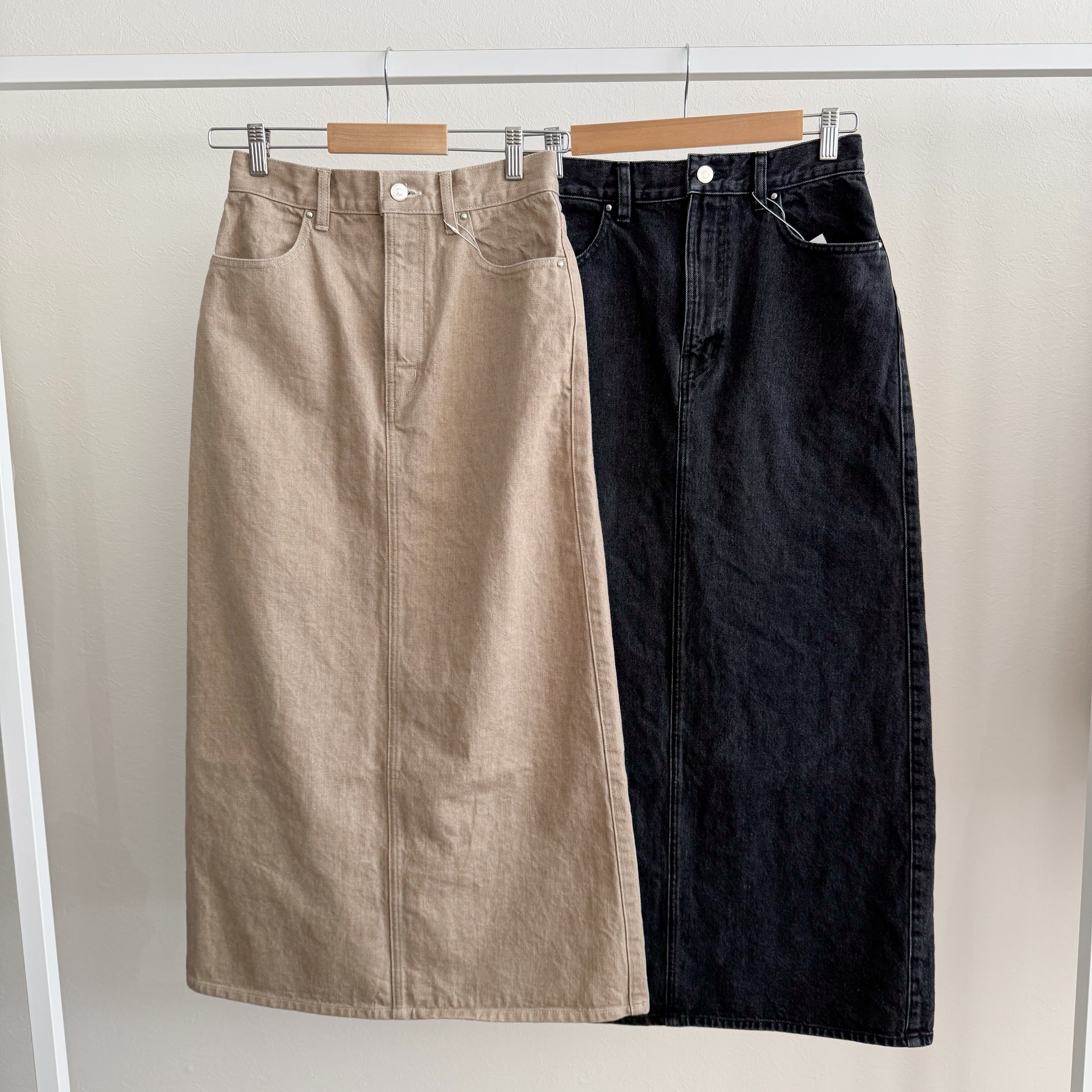 4ポケットのミニマルなデザインでハイウエスト、マキシ丈です。